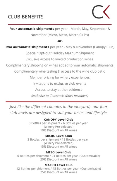 At Comstock Wines, we enjoy creating lasting memories and forming new friendships, while we share our favorite wines. When you join our Comstock Wines Wine Club, you become part of the Comstock Wines family and gain access to award-winning wines that are found only here at the winery. Enjoy tasting experiences and winery events created just for you. And best of all, share Comstock Wines with those you love.